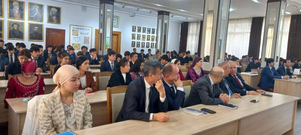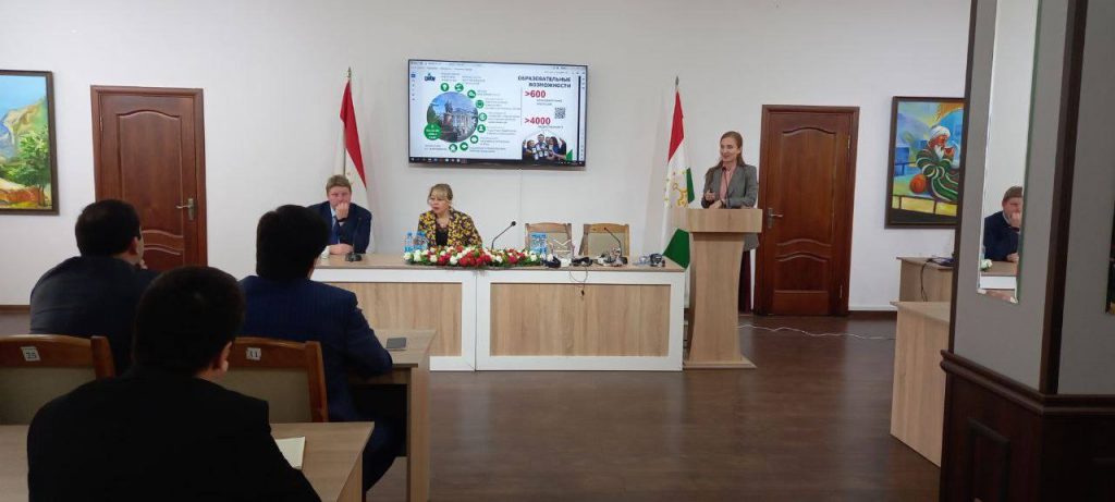 Сегодня на базе студенческого городка Таджикского национального университета (ТНУ) при участии студентов и преподавателей физического, биологического и медицинского факультетов ТНУ прошла лекция представителей Северного (Арктического) Федерального университета имени М.В. Ломоносова: Голомидовой П.С., начальником отдела по развитию экспорта образования УМС САФУ, Волковым А.С., заместителем директора Высшей школы естественных наук и технологий САФУ, Козыревой Е.А., ведущим экспертом по международному сотрудничеству отдела ЭО УМС САФУ.